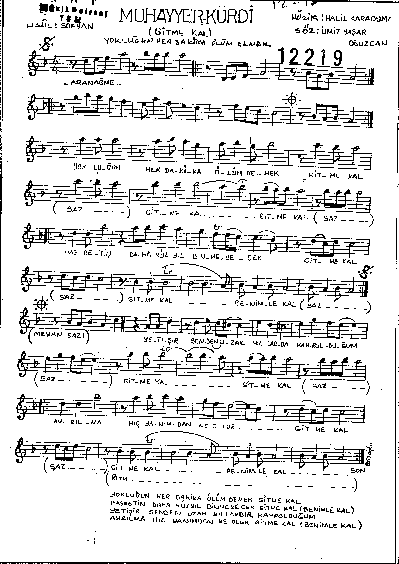 Sarki Adi: Yokluğun her dakika ölüm demek gitme kal