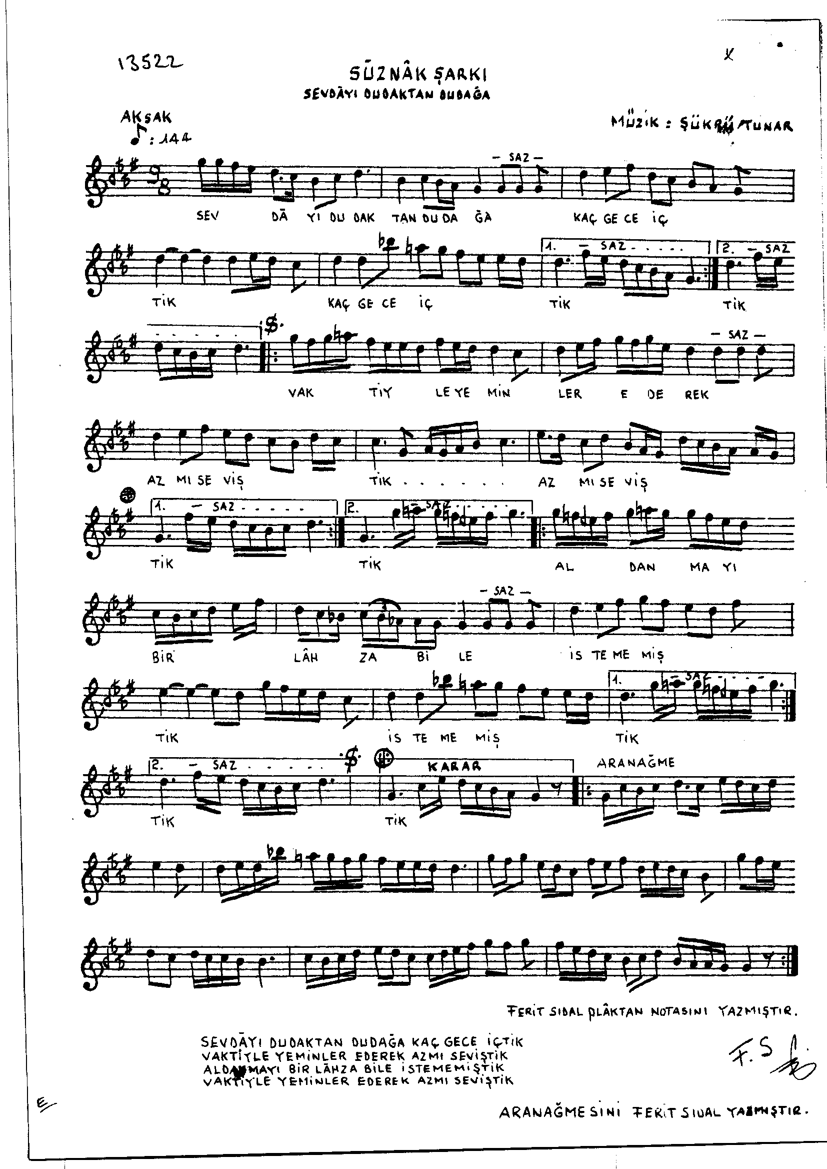 Sarki Adi: Sevdâyı dudaktan dudağa kaç gece içtik