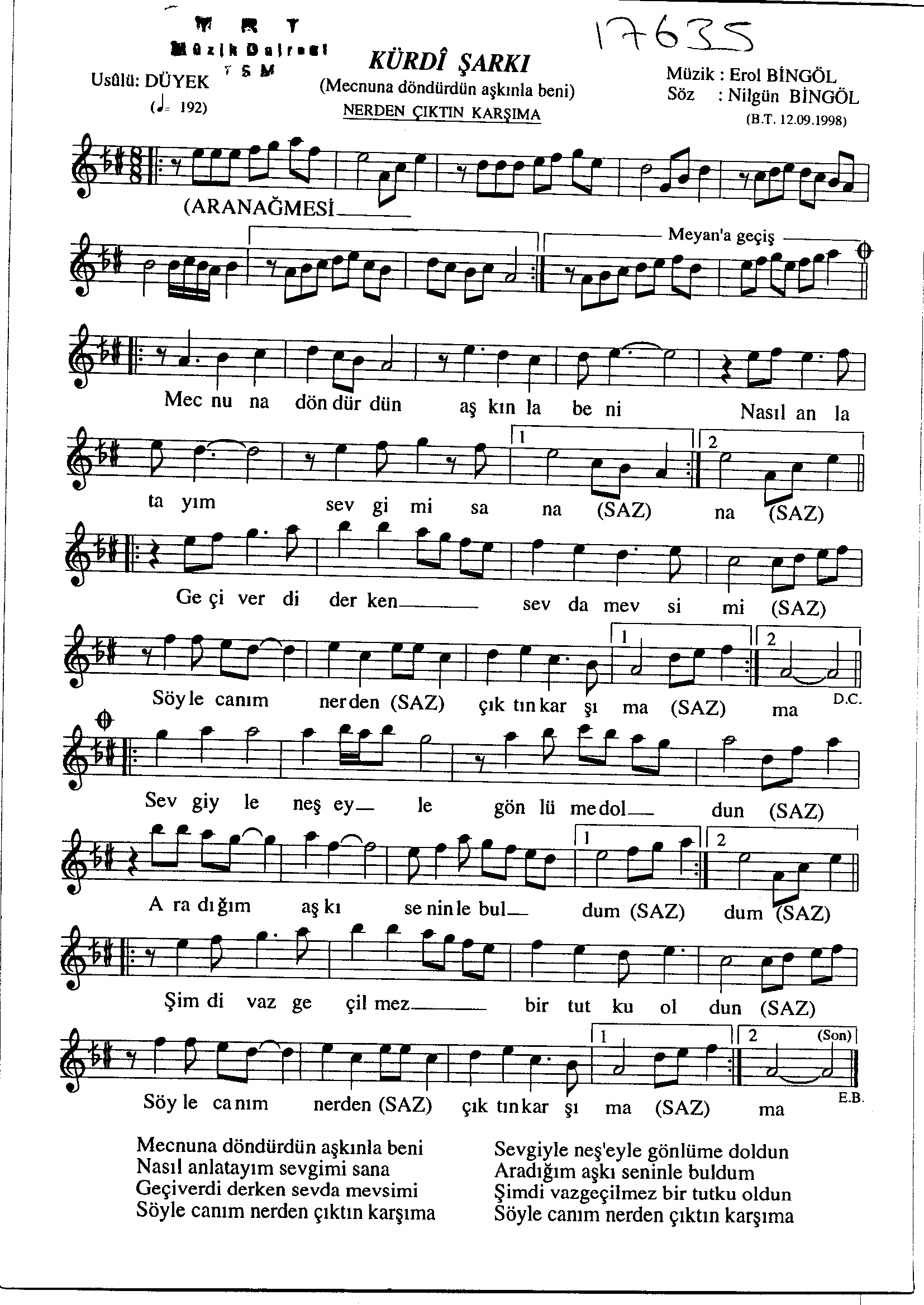 Sarki Adi: Mecnuna döndürdün aşkınla beni