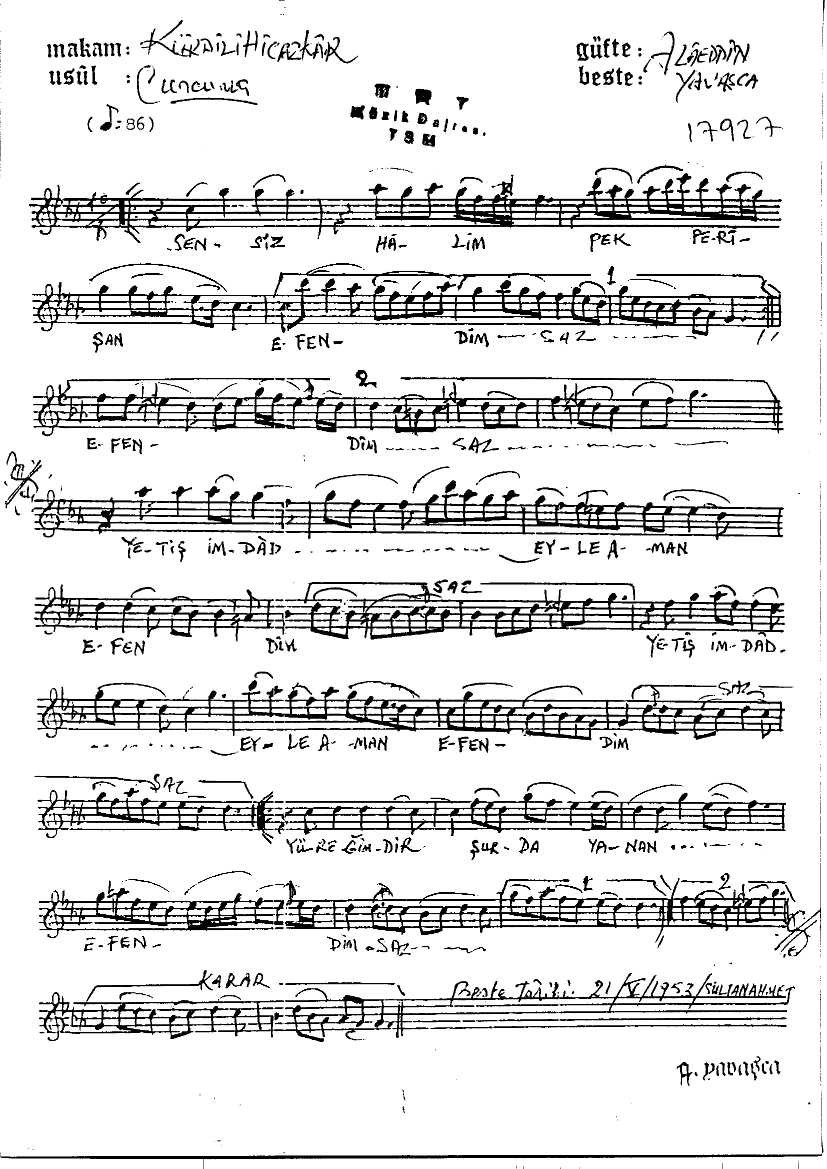 Sarki Adi: Sensiz hâlim pek perîşan efendim
