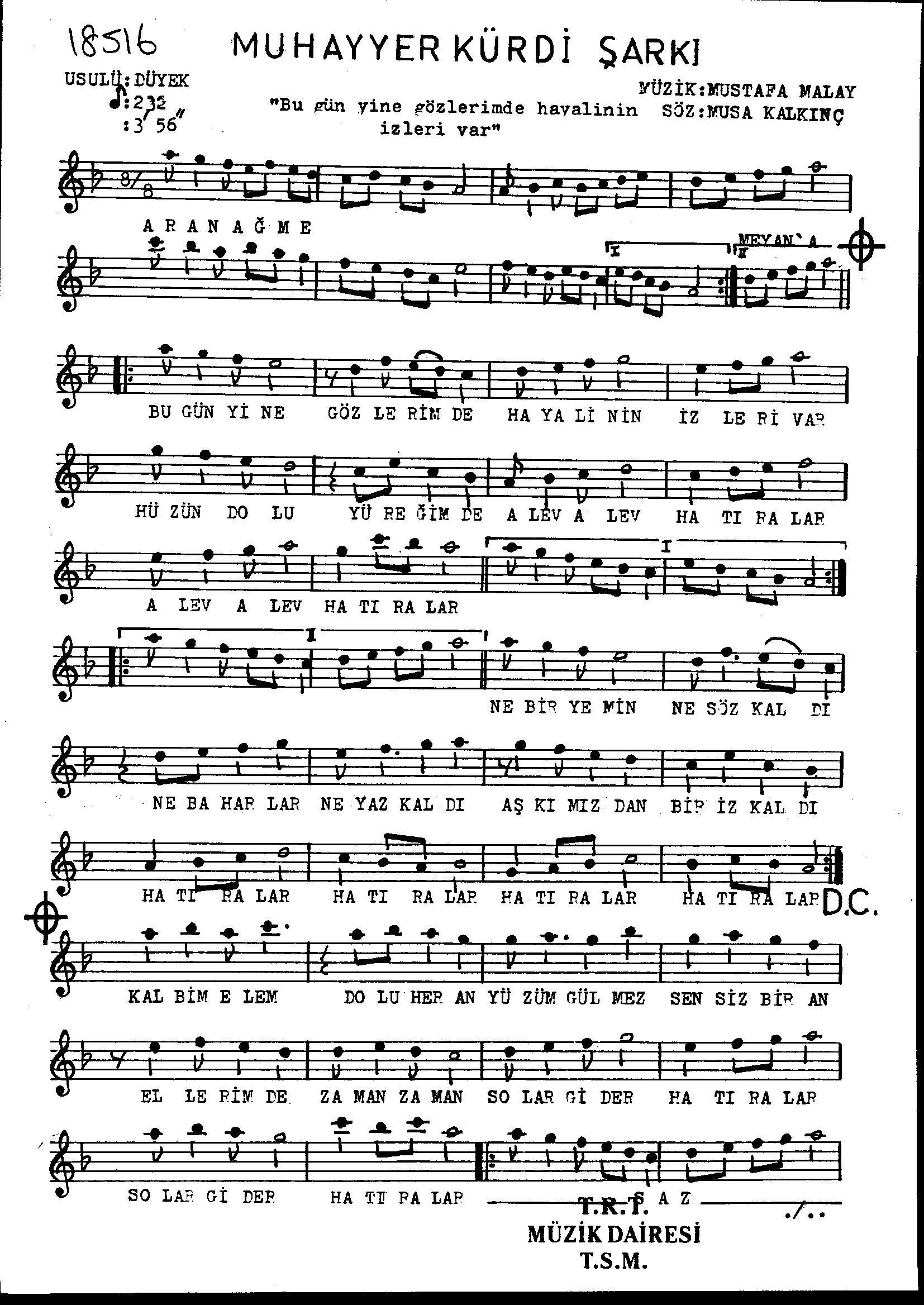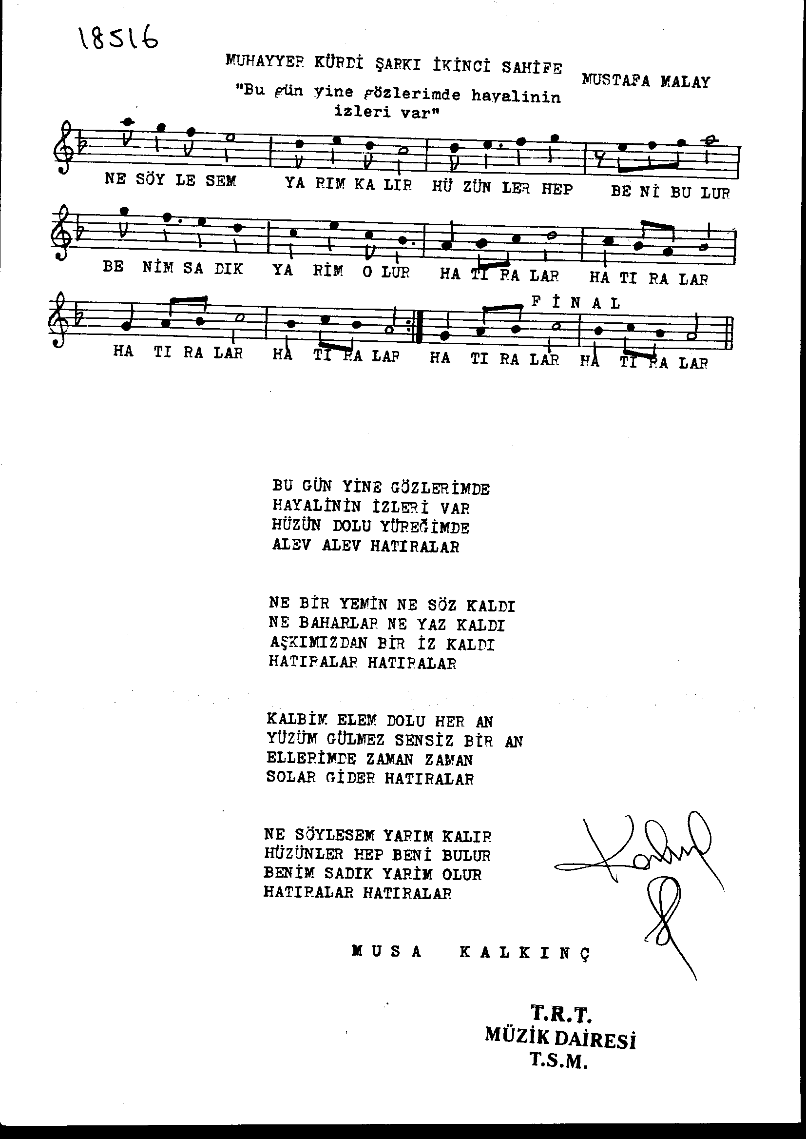 Sarki Adi: Bugün yine gözlerimde hayâlinin izleri var