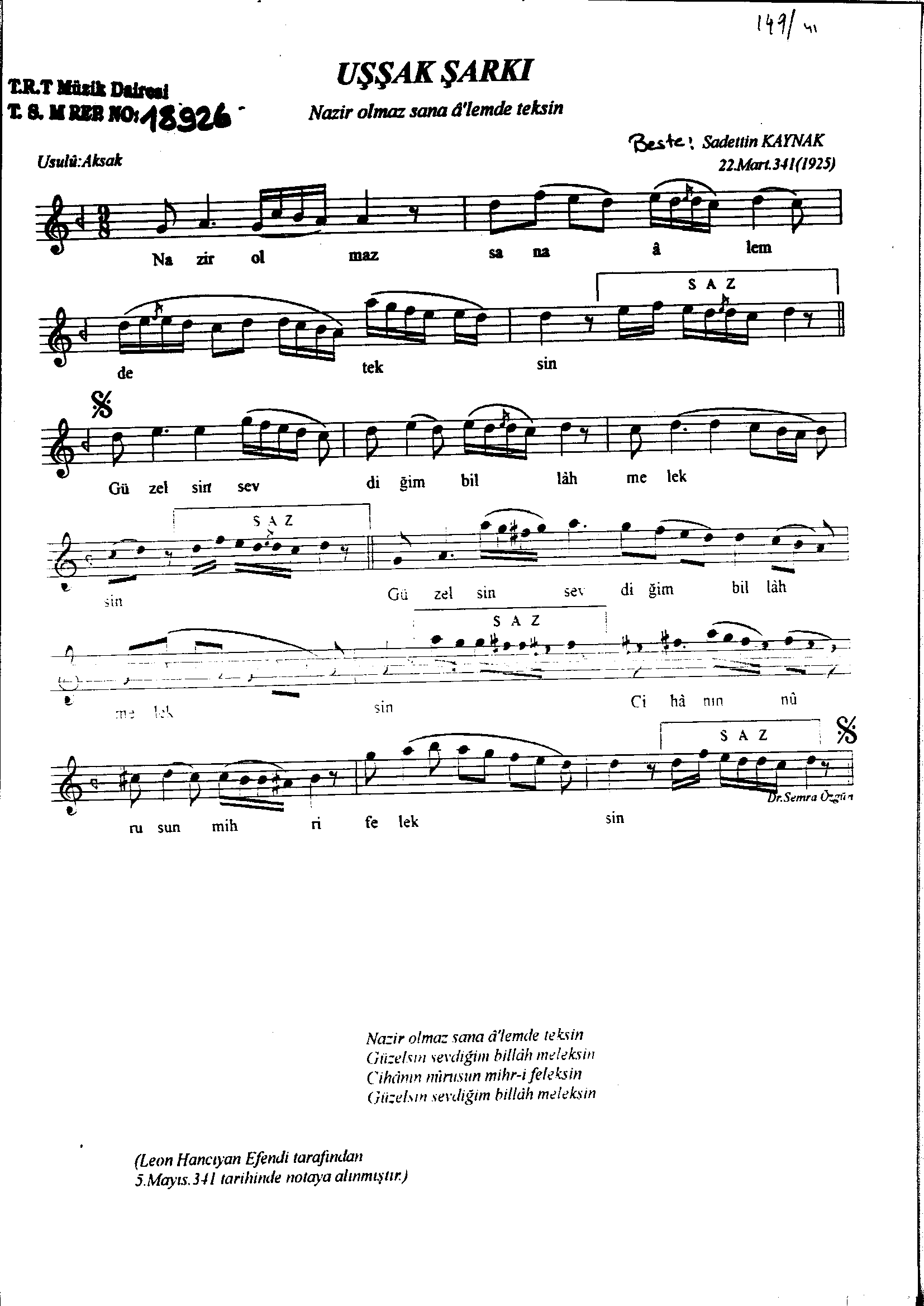 Sarki Adi: Nazir olmaz sana alemde teksin