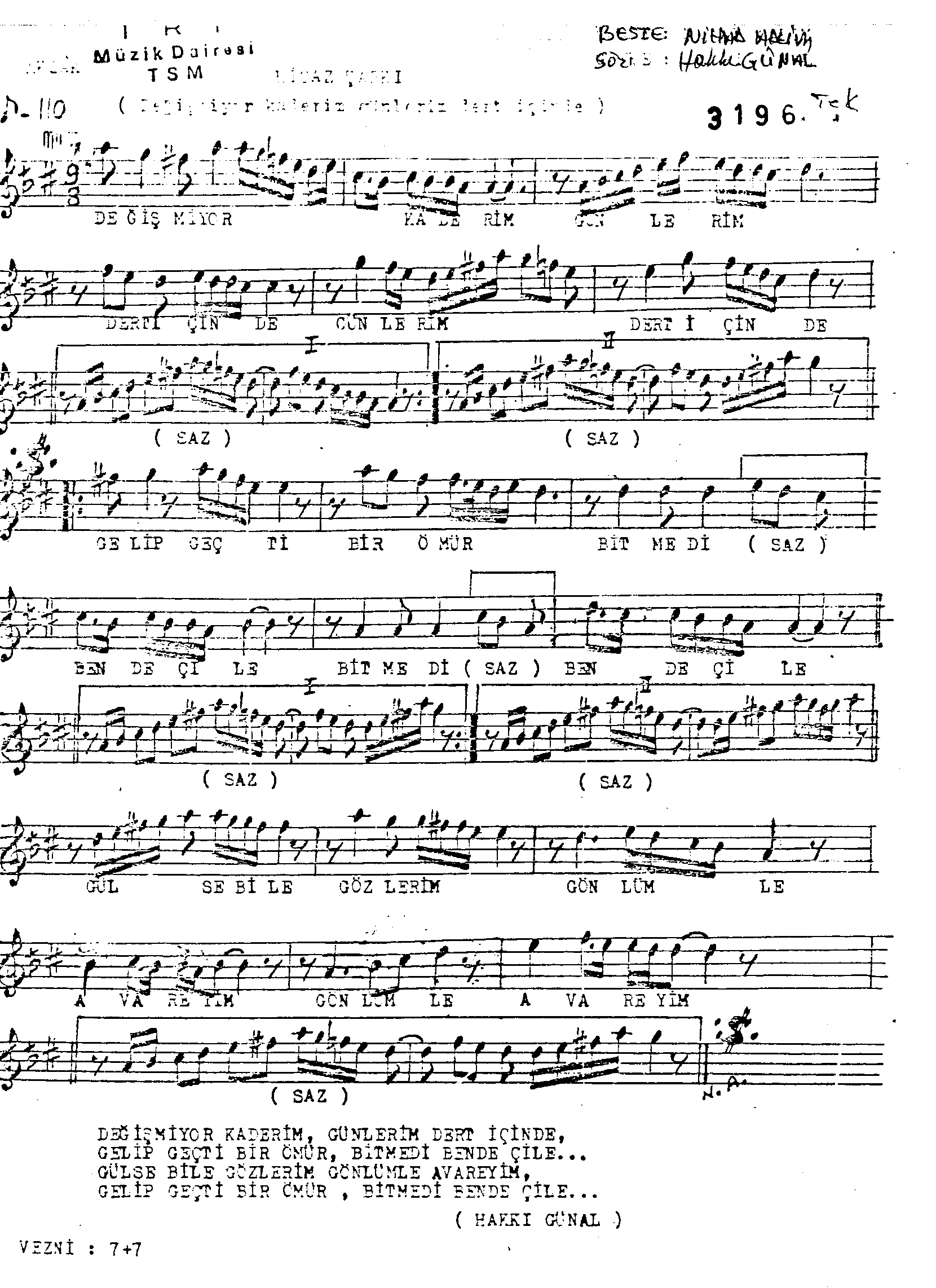 Sarki Adi: Değişmiyor kaderim günlerim derd içinde