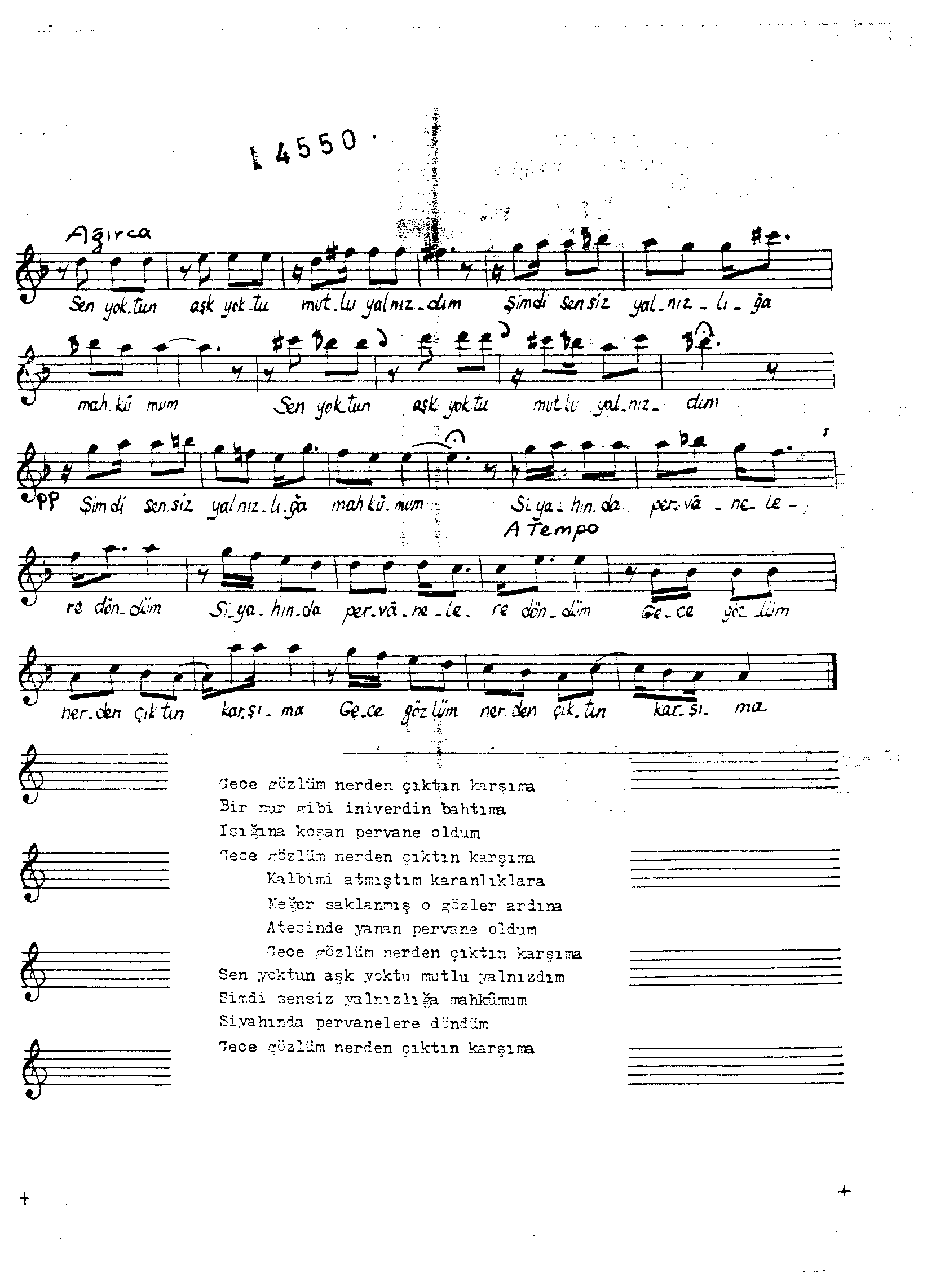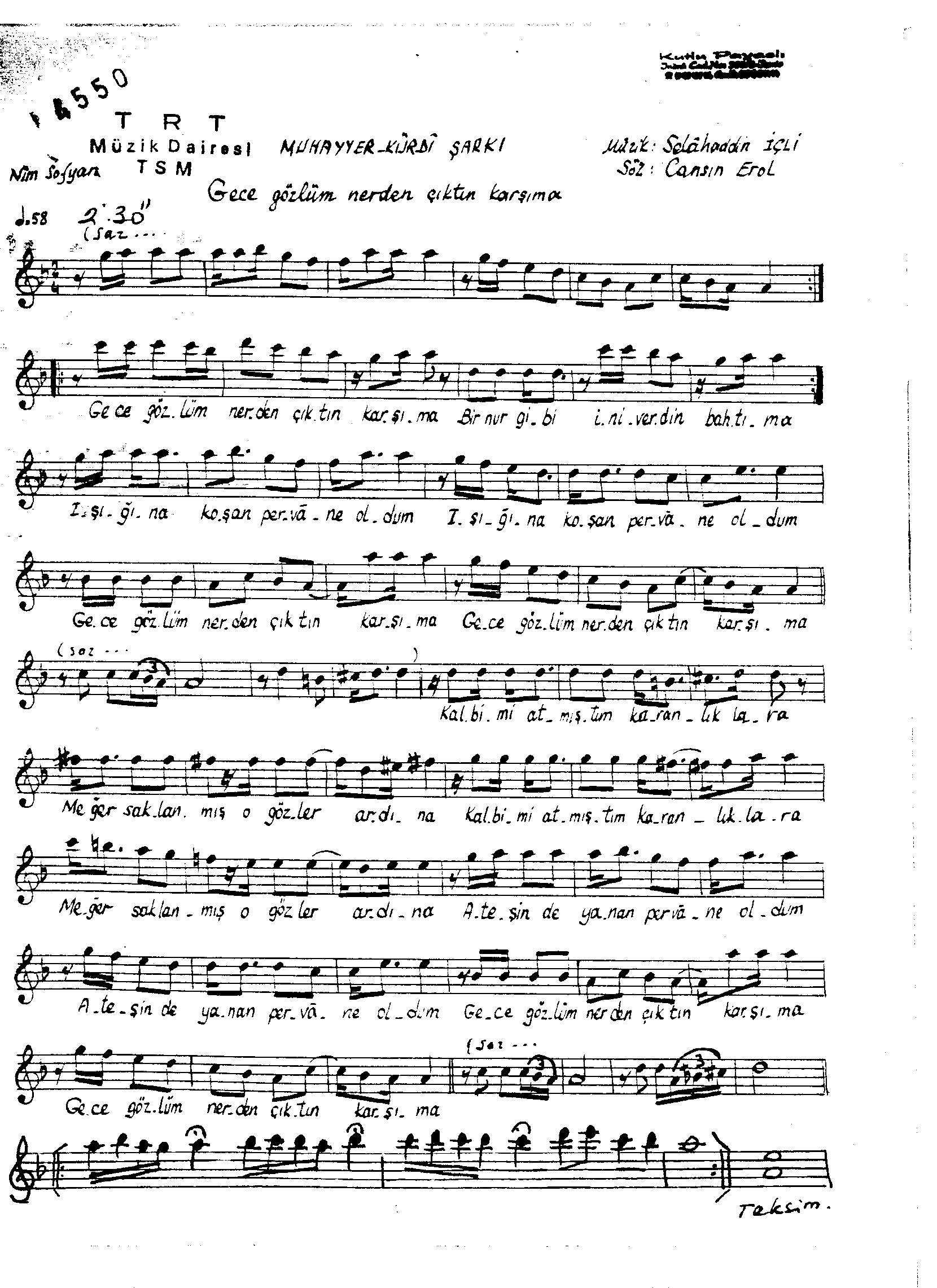 Sarki Adi: Gece gözlüm nerden çıktın karşıma
