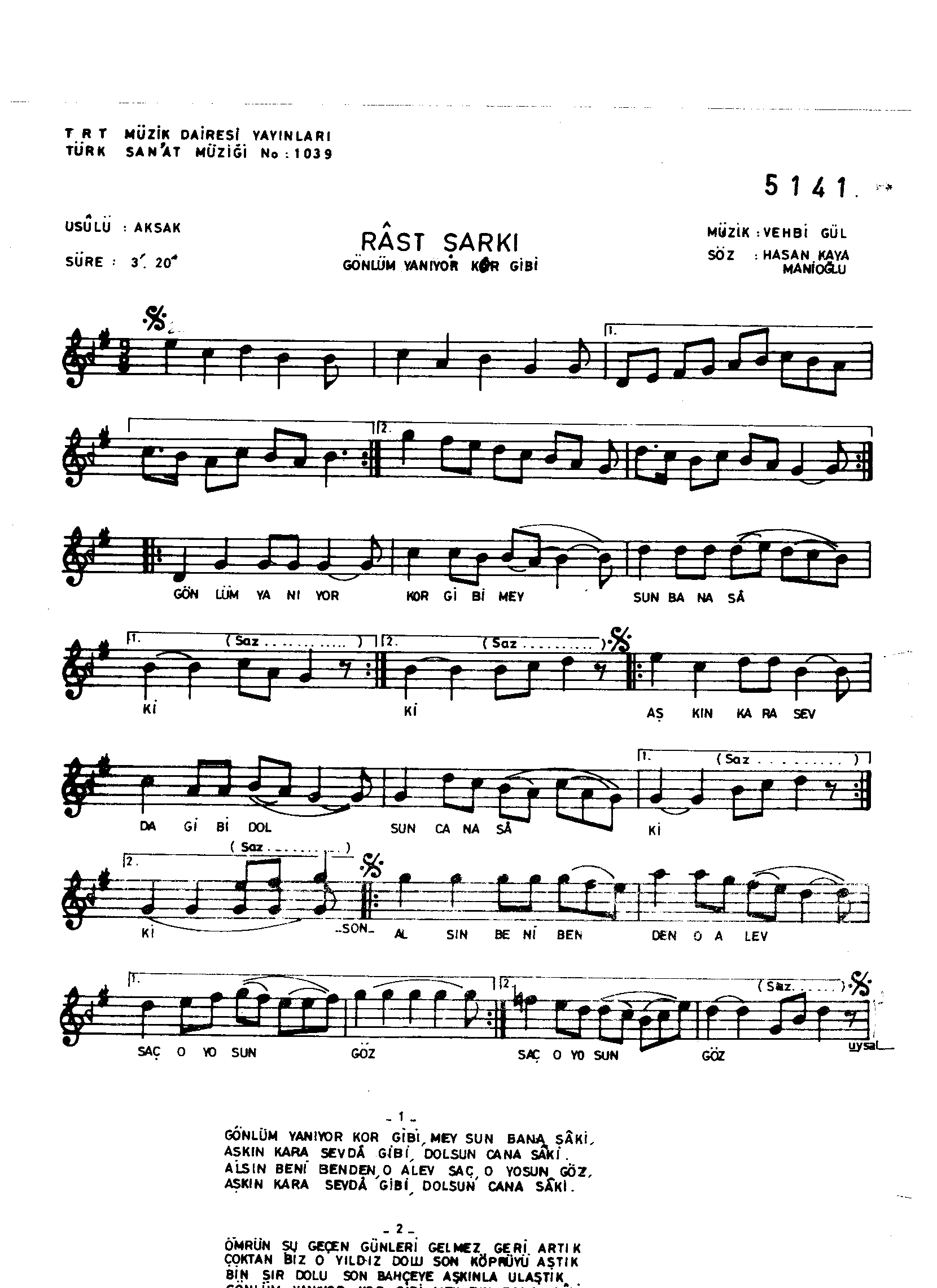 Sarki Adi: Gönlüm yanıyor kor gibi mey sun bana sâkî