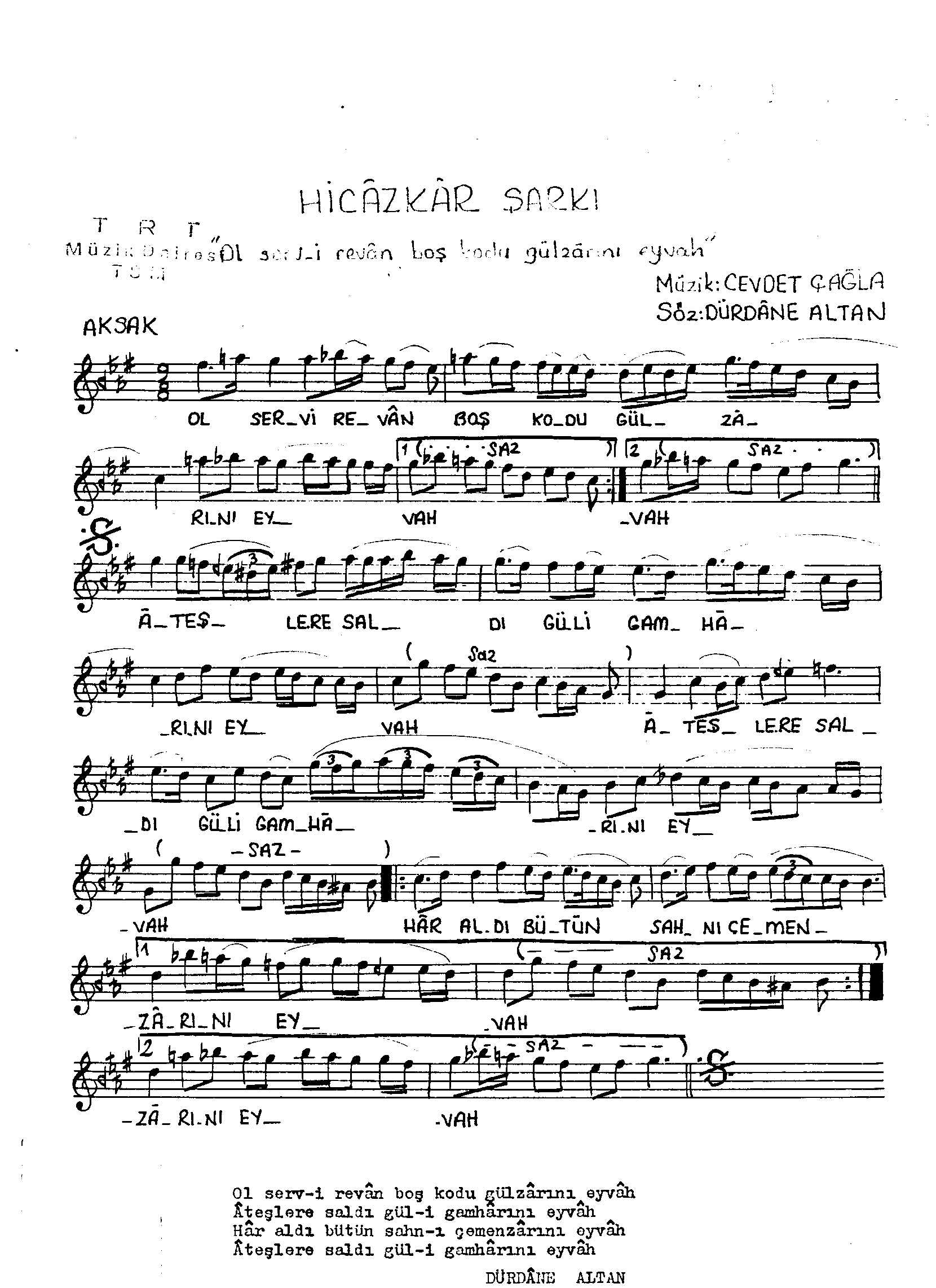 Sarki Adi: Ol serv-i revân boş kodu gülzârını eyvâh